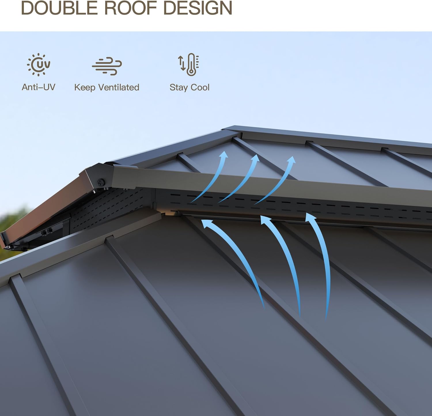 Trumbeak’s 12' x 14' Hardtop Gazebo.Designed with durability in mind,this gazebo features a sturdy galvanized steel metal double roof and a metal frame,ensuring long-lasting performance in any weather conditions.Create a cozy and inviting atmosphere with the included curtains and netting.These versatile accessories provide privacy and protection from insects,allowing you to fully enjoy your patio,lawn,or garden area.