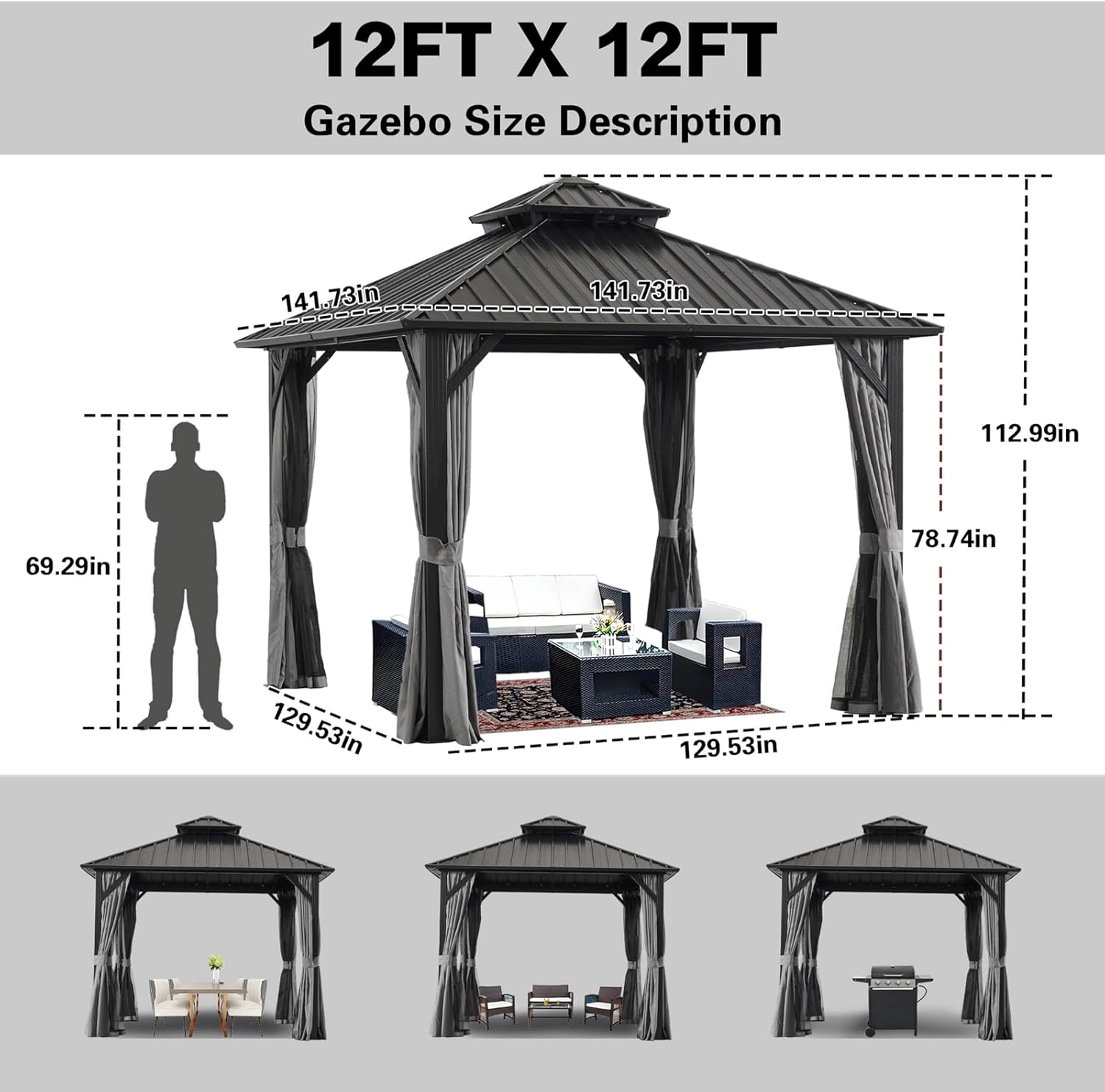 Endark 12x12FT Outdoor Hardtop Double Roof Gazebo with Galvanized Steel Roof, Heavy Duty Metal Frame Canopy with Mosquito Netting and Privacy Curtains (12 * 12FT)