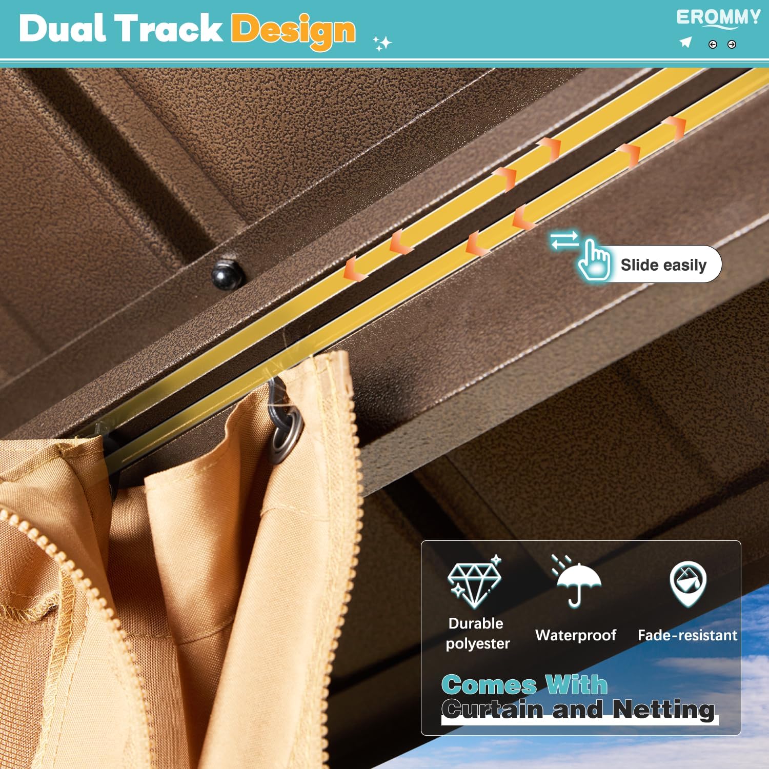 EROMMY 10' x 12' Hardtop Gazebo, Aluminum Frame Gazebos with Galvanized Steel Double Roof, Permanent Outdoor Metal Pavilion with Curtain and Netting for Patio, Lawn, Deck
